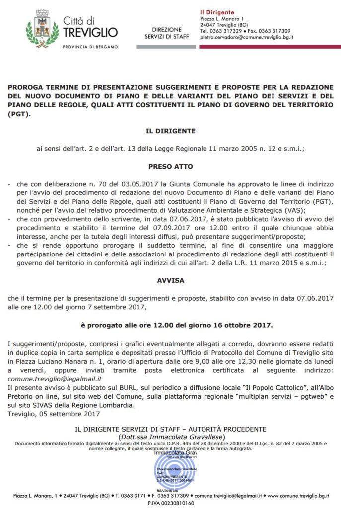 E’ stato prorogato alle ore 12 del 16 ottobre 2017 il termine di presentazione di suggerimenti e proposte per la redazione del nuovo Documento di Piano e delle varianti del Piano dei servizi e del Piano delle regole del PGT.
