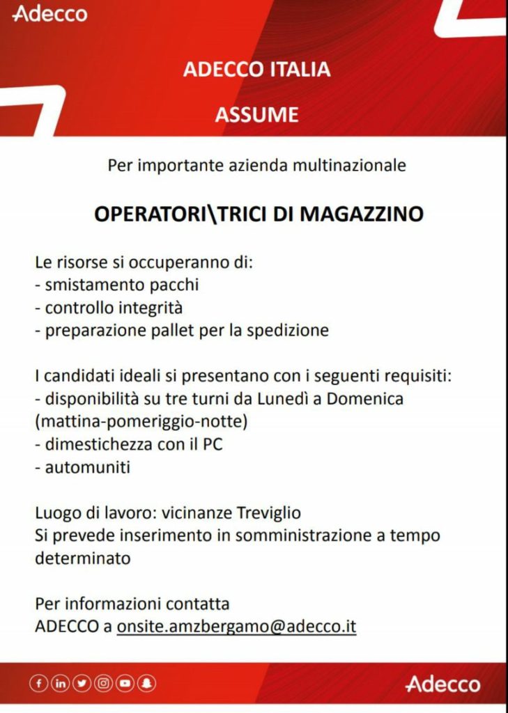 Adecco sta seguendo la selezione di personale per un’importante realtà multinazionale che aprirà un sito in zona. Allego la locandina con i dettagli dell’offerta e i riferimenti.